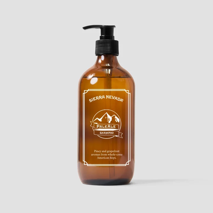 - The team felt that packaging the shampoo in a literal beer bottle was not only too "literal", but also too kitschy for the Beersthetic Persona that we had defined earlier. We decided on a sleek, amber-colored plastic bottle with a pump nozzle to still be reminiscent of a Sierra Nevada Beer, but not glass, as something that will be kept in the shower has a very high chance of falling (and possibly shattering, in the case of glass.)